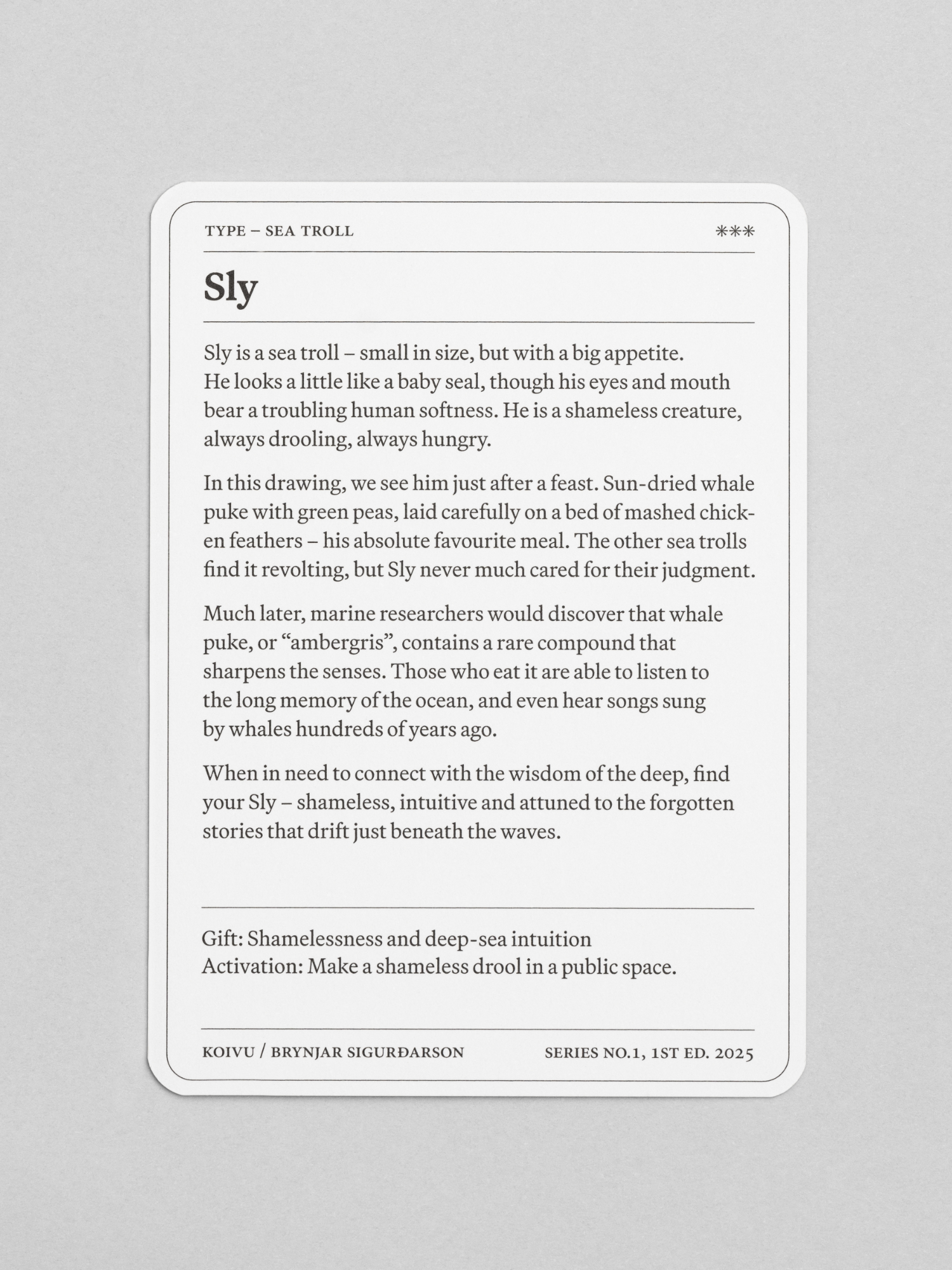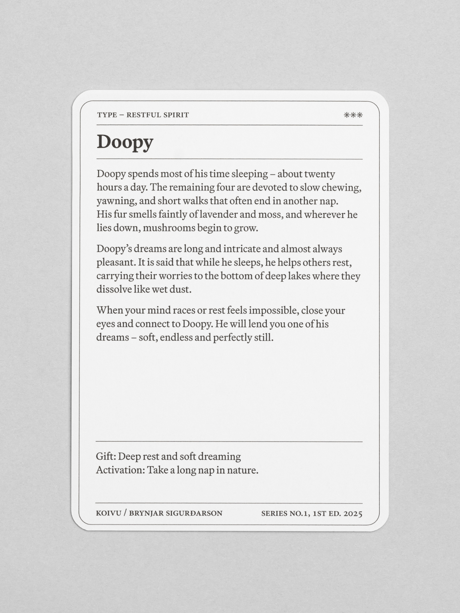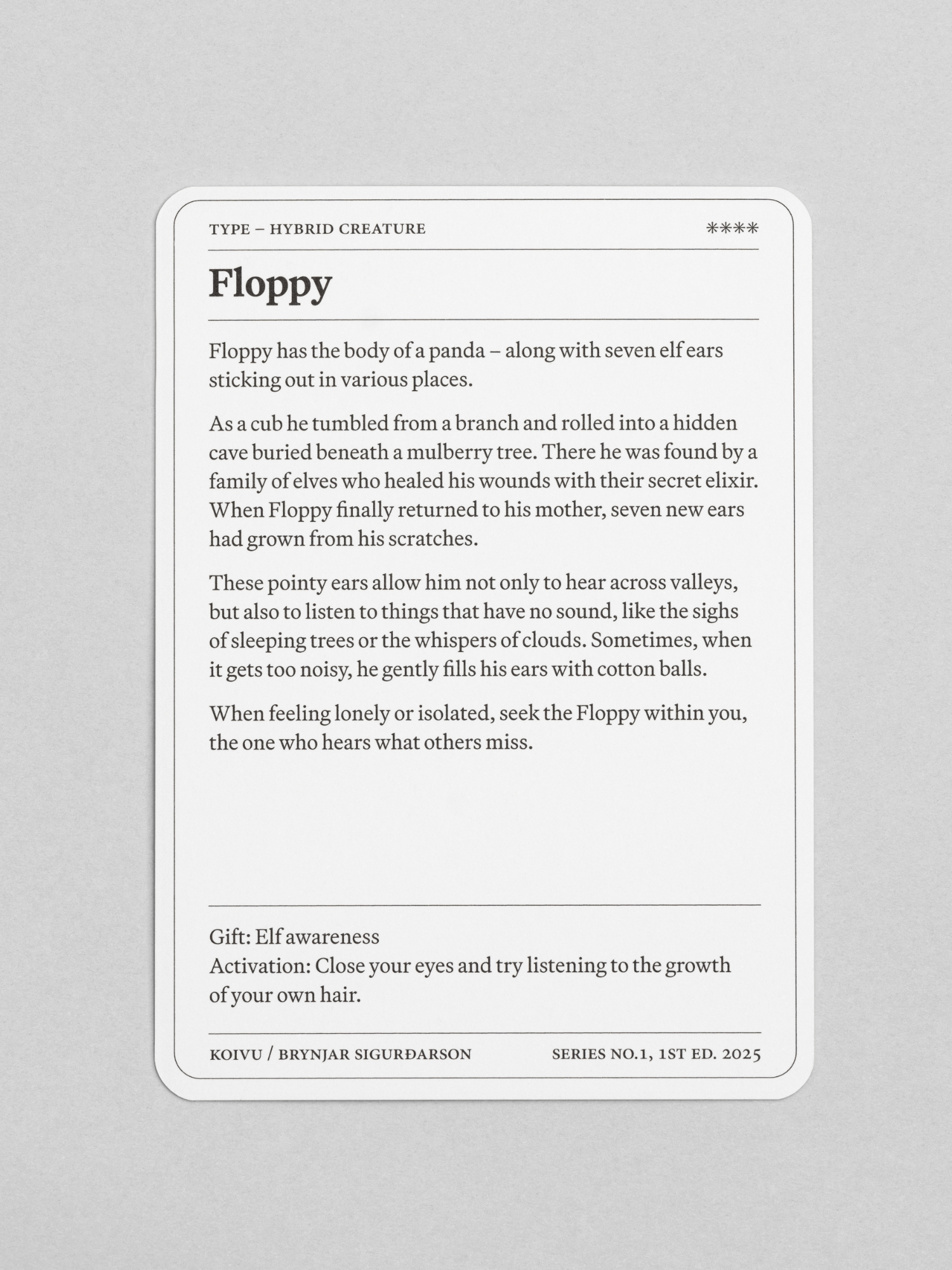 These are the first seven figures in a growing family of supernatural characters, presented as a limited edition of collectible cards. “The supernatural is natural,” says Brynjar Sigurðarson, who conceived Sly, Floppy, Doopy and their peculiar companions. Each figure tells a story and functions as a talisman, embodying a distinct yet quiet power: calming restless minds, sparking courage or curiosity, awakening laughter. Mischievous yet kind, they remind us that the modern world still hums with unseen presences – if we pause long enough to notice them.